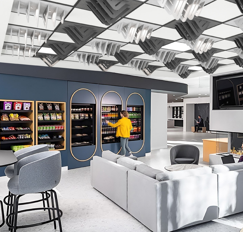 将三角形等几何图形的不同角度、大小和方向的拼接,形成错落有致的立体结构,为天花板增添了丰富的层次感和深度感。在视觉上得到了延伸和拓展,增强了空间的立体感和动态感。